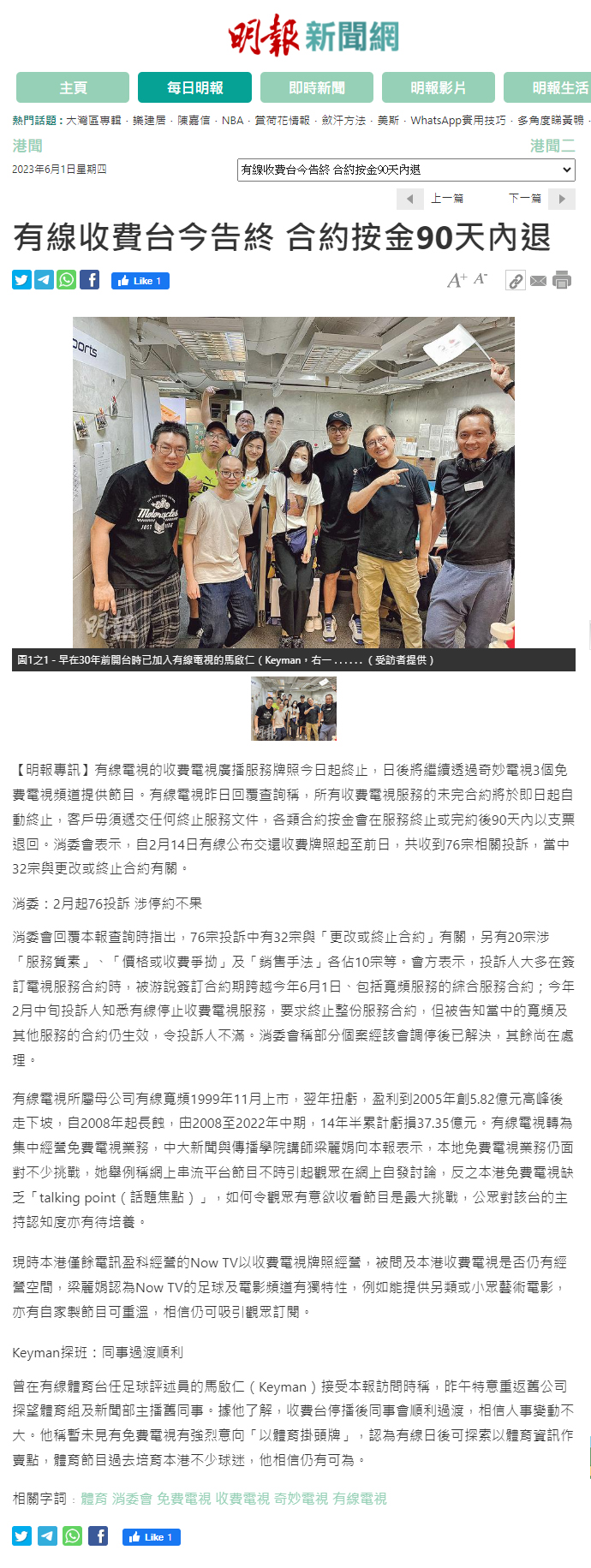 有線收費台今告終 合約按金90天內退