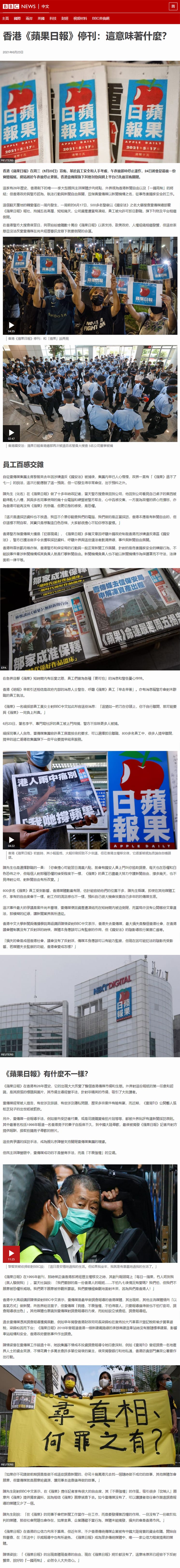 //香港中文大學新聞與傳播學院高級講師陳惜姿對BBC中文表示,香港失去壹傳媒,最大損失是整個香港社會,在香港議會體制裏沒有了反對派的時候,媒體本身應該可以有監察的作用,但《國安法》的陰影導致行業唇亡齒寒。「損失的會是成個香港社會,議會沒有了反對派,傳媒本身應該可以有能力監察,但現在因可能犯法的陰影而受影響,若媒體失去監察的功能,香港會變成怎樣?」//
