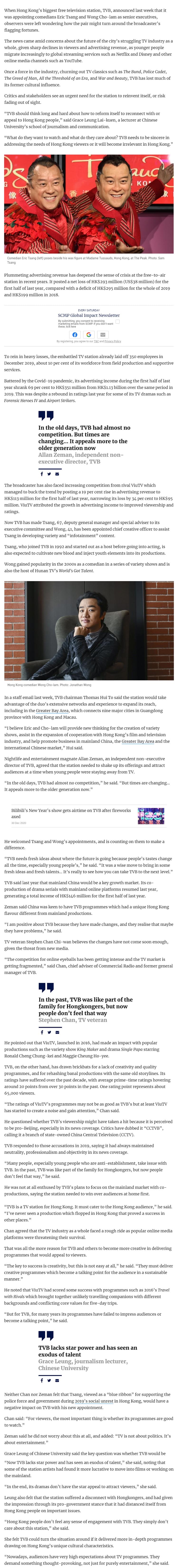 “TVB should think long and hard about how to reform itself to reconnect with or appeal to Hong Kong people,” said Grace Leung Lai-kuen, a lecturer at Chinese University’s school of journalism and communication.