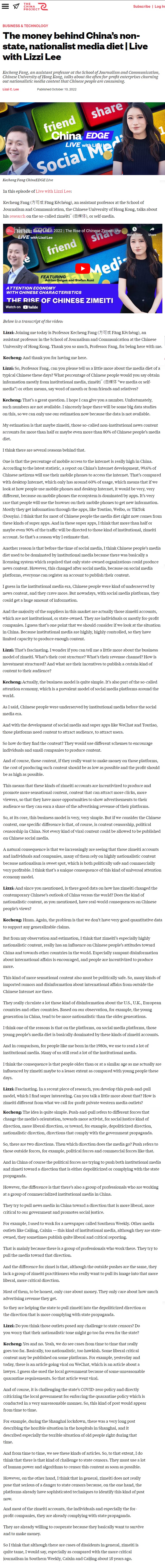 Prof. Kecheng Fang talks about his research on Zimeiti (自媒體) in the video with “The China Project”. He thinks that nowadays many of the Zimeiti accounts in China rely on highly nationalistic content, which is both politically safe and commercially very profitable.