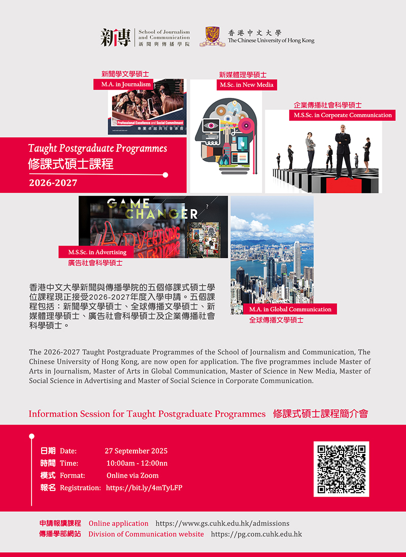 香港中文大學新聞與傳播學院的2026-2027年度修課式碩士課程現已接受申請。五個課程包括:全球傳播文學碩士、新聞學文學碩士、新媒體理學碩士、廣告社會科學碩士^及企業傳播社會科學碩士。