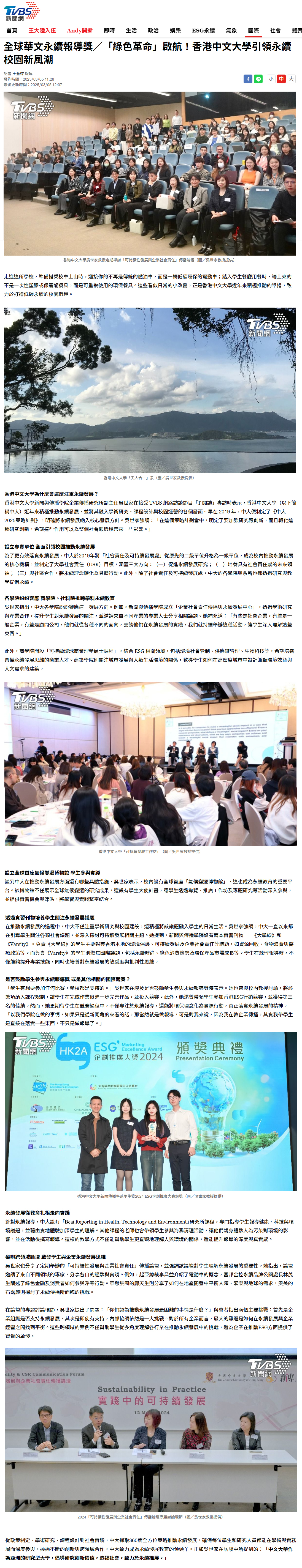 //香港中文大學新聞與傳播學院企業傳播研究所副主任吳世家在接受 TVBS 網路訪談節目「T 閱讀」專訪時表示,香港中文大學(以下簡稱中大)近年來積極推動永續發展,並將其融入學術研究、課程設計與校園運營的各個層面。//