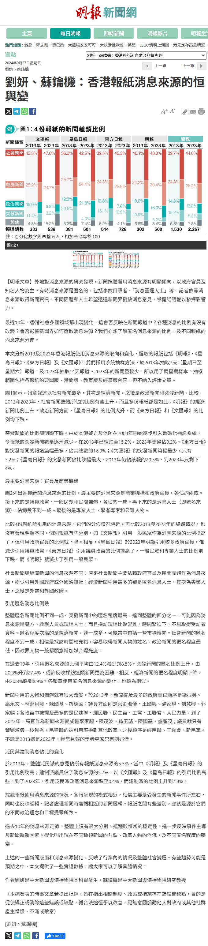 劉妍、蘇鑰機:香港報紙消息來源的恒與變
