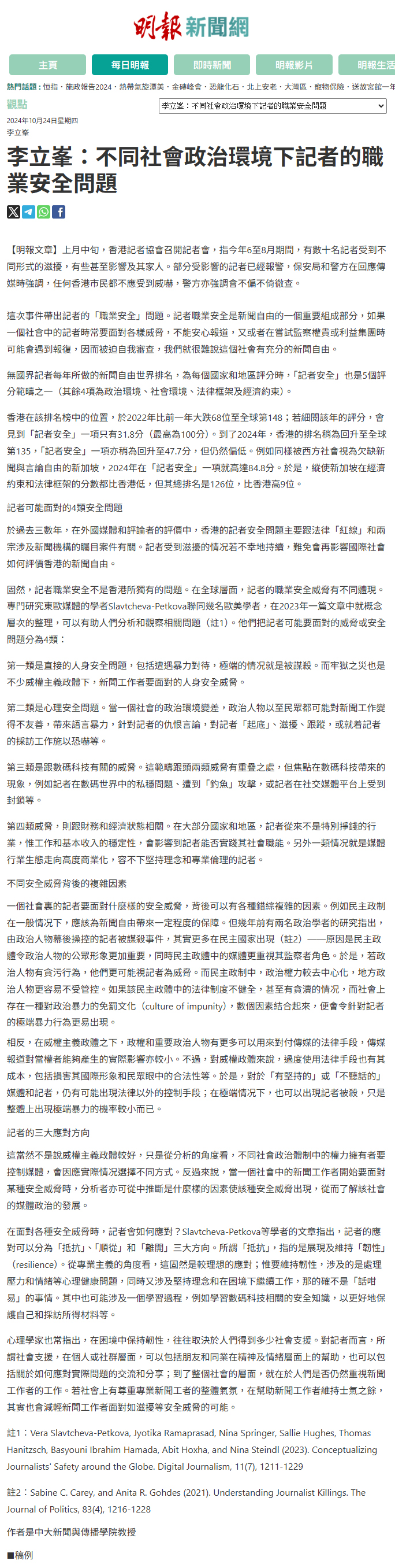 ……固然,記者職業安全不是香港所獨有的問題。在全球層面,記者的職業安全威脅有不同體現。專門研究東歐媒體的學者Slavtcheva-Petkova聯同幾名歐美學者,在2023年一篇文章中就概念層次的整理,可以有助人們分析和觀察相關問題。他們把記者可能要面對的威脅或安全問題分為4類……//