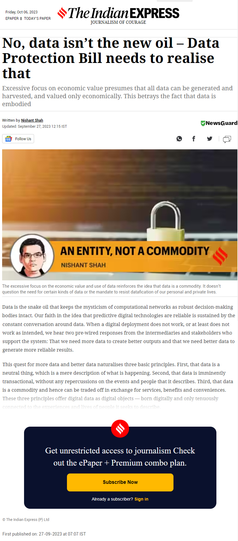 …The aspirations of the Personal Data Protection (DPDP) Act 2023 will be met only if the operational realities question and critique the three principles which are often used to weaponise data against those who are the most vulnerable and precarious.//