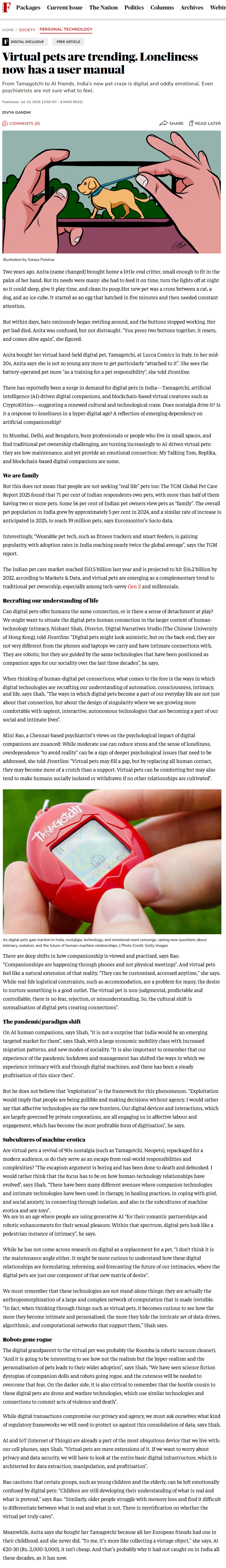 …Nishant Shah, Director, Digital Narratives Studio (The Chinese University of Hong Kong), told Frontline. “Digital pets might look animistic, but on the back-end, they are not very different from the phones and laptops we carry and have intimate connections with. They are robotic, but they are guided by the same technologies that have been positioned as companion apps for our sociality over the last three decades”, he says.
