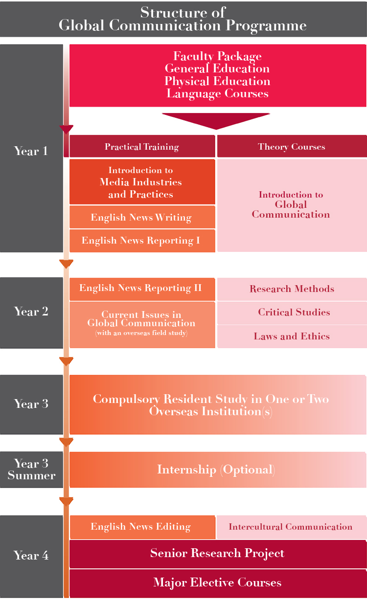本課程理論和實踐並重。課程的理論部分探討全球化的複雜本質、發展過程及對媒體的影響,以及在跨文化環境中溝通的挑戰。實踐部分讓學生參與校內英文新聞雜誌Varsity的製作,亦可選修與整合營銷傳播和創意媒體相關的科目。除此之外,課程設海外考察,學生將在老師的監督下進行原創研究和製作。