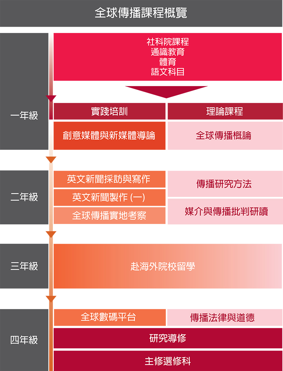 全球傳播社會科學學士課程致力培養學生成為推動可持續未來的次世代傳播專才。本課程提供明確的學習路徑,幫助學生掌握敘事技巧、理解新興科技(如平台與人工智慧)如何重塑全球傳播生態,並評估地緣政治對媒體與資訊全球流動的影響。透過結合傳播理論、實務訓練與體驗式學習的整合式課程,我們賦予學生專業能力,使其能在全球可持續發展的關鍵議題上發聲。學生亦將具備在媒體產業內外從事傳播相關職涯的紮實準備。